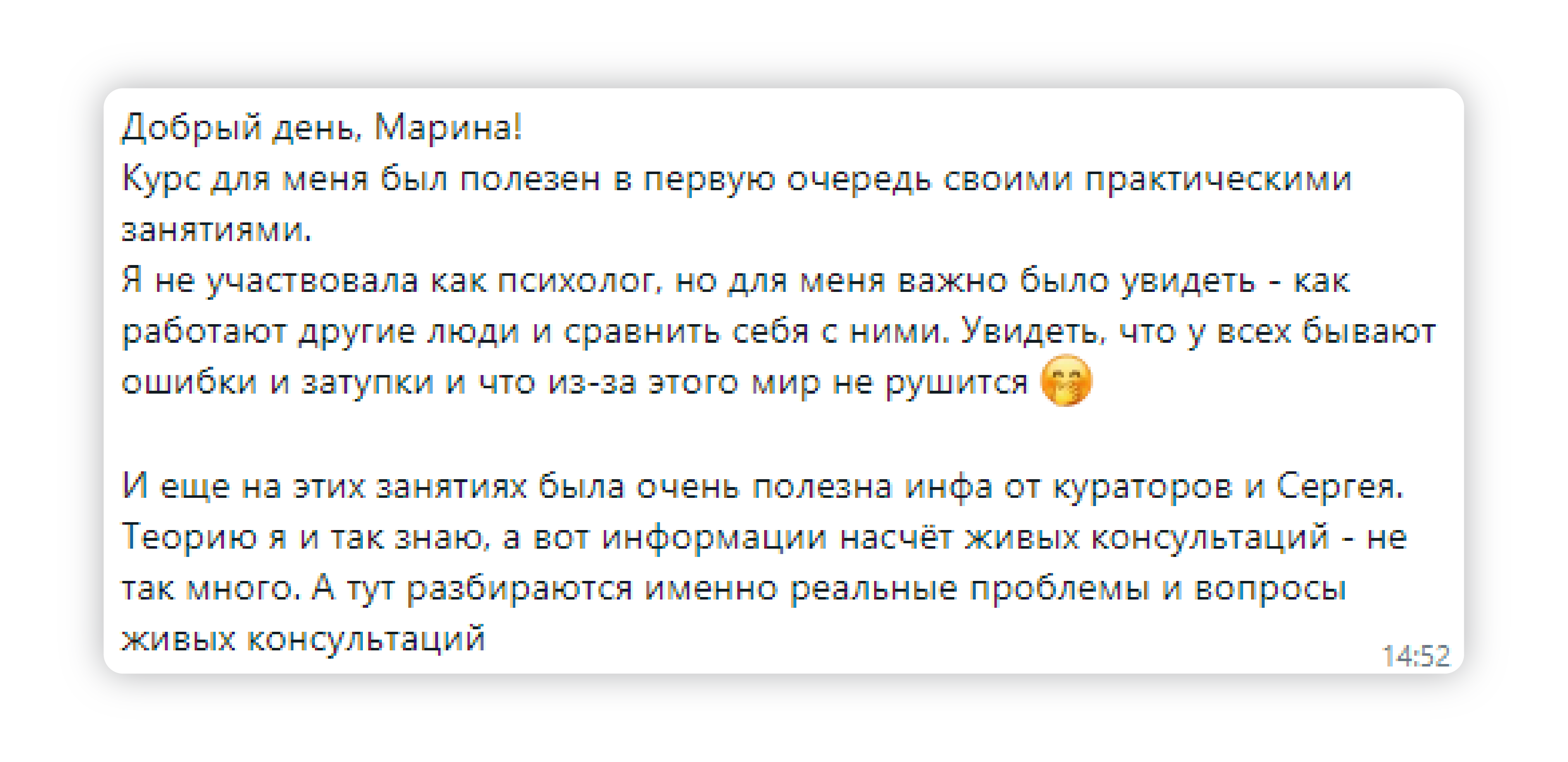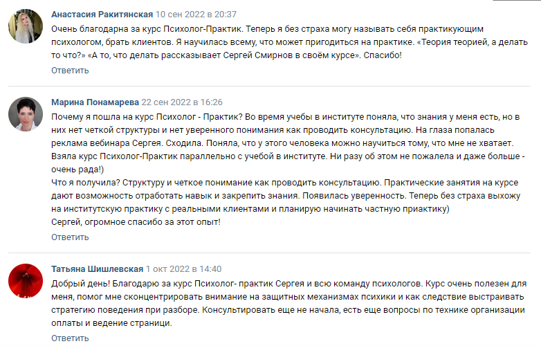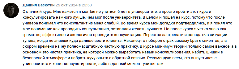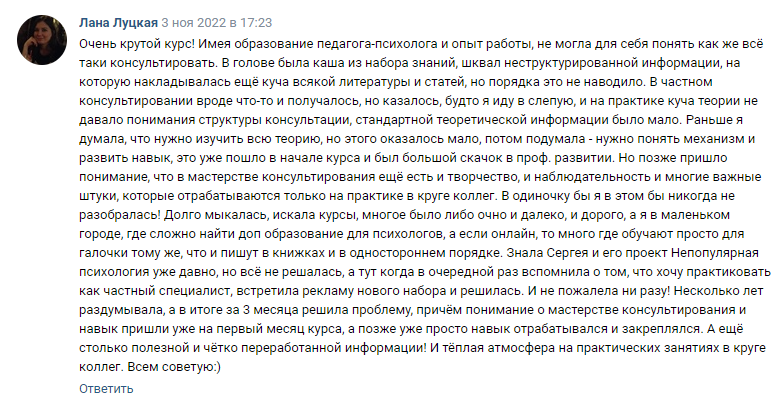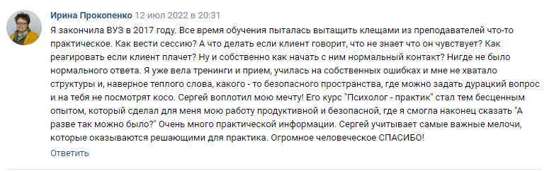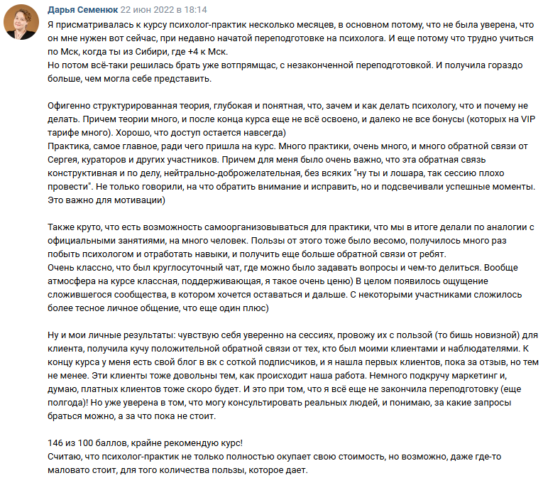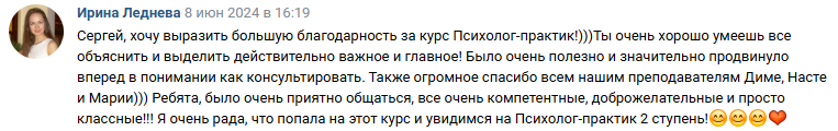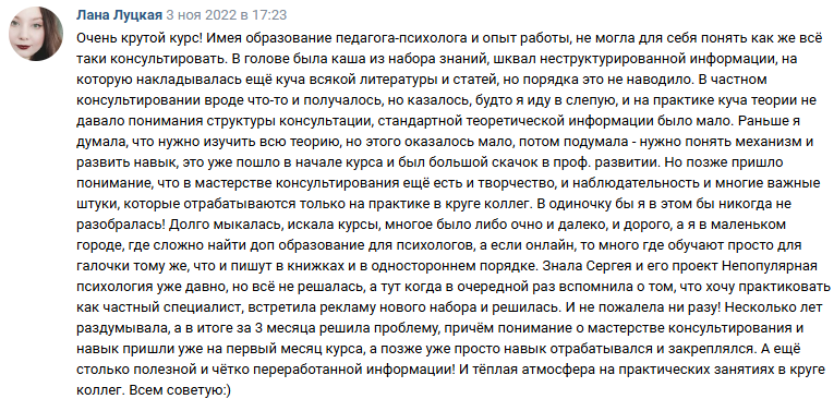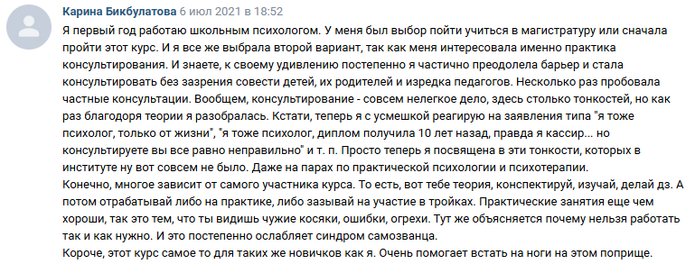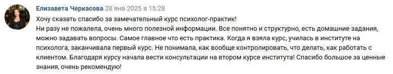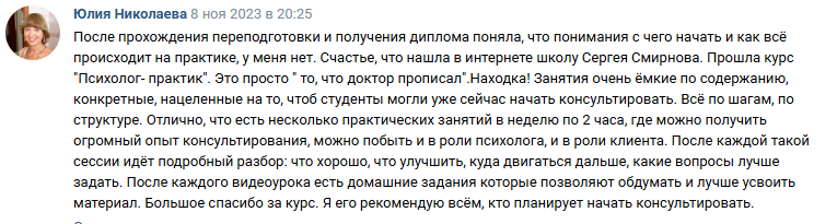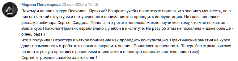 ✔ начала видеть себя в роли психолога и поняла логику процесса консультирования, что и как делает психолог